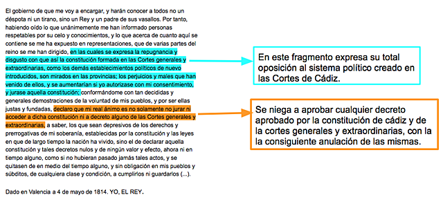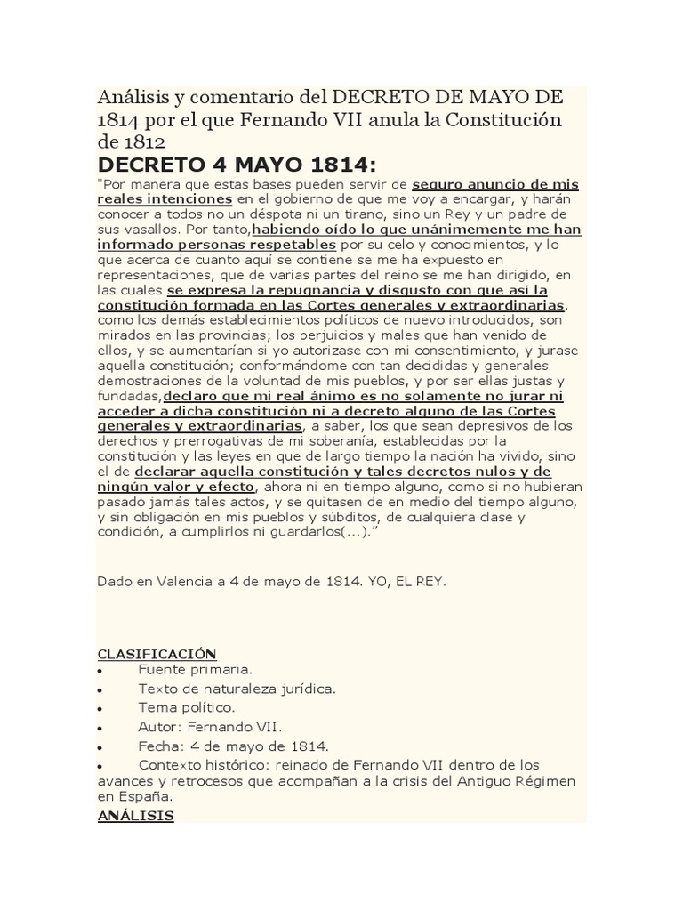 A.tipo de texto, clase de fuente y destinatario. Ahora ni en tiempo alguno, como si no hubieran pasado jamás tales actos, y se quitasen de en medio del tiempo alguno, y sin obligación en mis pueblos y súbditos, de cualquiera clase y condición, a cumplirlos ni guardarlos. dado en valencia a 4 de mayo de 1814. El real decreto del 4 de mayo de 1814, anuló la constitución de cádiz y anunció la vuelta al absolutismo. Ver calendario completo del año 1814 en venezuela. Una de las reformas de la asamblea del año 13 fue la creación por ley del 22 de enero de 1814 del directorio, ante la necesidad de un poder ejecutiva unipersonal, para dar firmeza y estabilidad al gobierno.